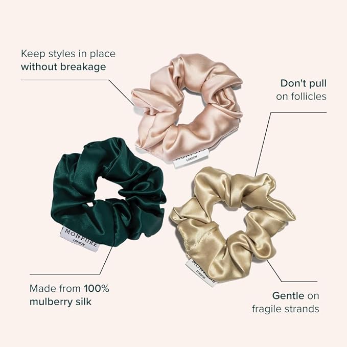 Premium and meticulously crafted, these Monpure silk scrunchies don’t just look exquisite but are designed to be gentle on your fragile hair. This trio of scrunchies has been specially created using the highest grade 100% mulberry silk. Extremely soft on your delicate strands, while keeping your style in place, they’re destined to become a treasured part of your haircare regime.